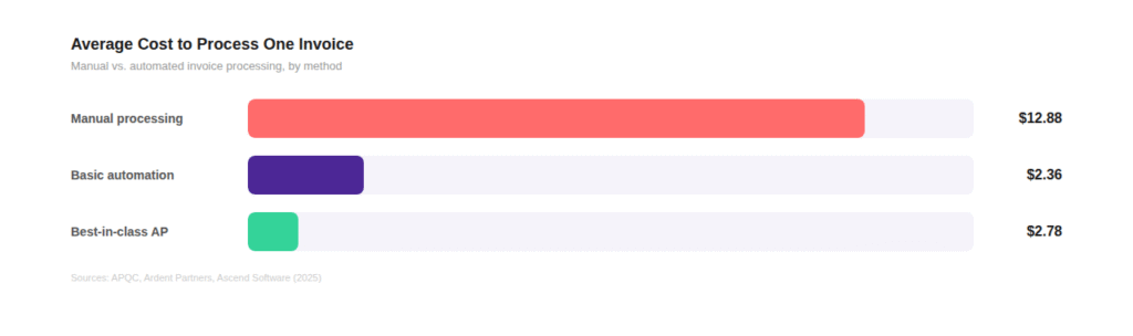 Automated invoice processing has a straightforward value proposition. Instead of manually keying supplier invoices into accounting software, AI extracts the data, categorises it, assigns the correct VAT rate, and posts it to the ledger. The economics are well documented: manual processing averages 2.88 per invoice, while AI-powered automation brings that down to as low as .36. That is an 80% cost reduction, according to industry benchmarks from APQC and Ascend Software.