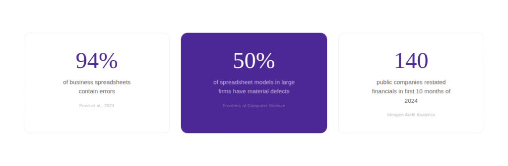 The formula is technically correct. It did exactly what it was told. But it has no way of knowing the input was wrong. A 2024 peer-reviewed study across 35 years of research found that 94% of business spreadsheets contain errors. This is how most of them happen. Not through broken formulas, but through unchecked inputs feeding into valid calculations.